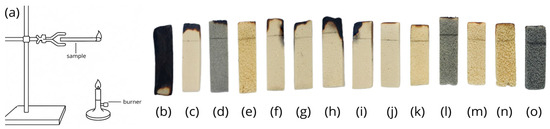 Flammability test: test stand (a); Ref (b); Mel (c); Mel + GE (d); Mel + Exolit (e); Mel + B7 (f); Mel + PLO (g); Mel + B7 + PLO (h); Mel + APP (i); APP (j); Exolit + APP (k); Exolit + GE (l); Mel + Exolit (60 wt.%) (m); Exolit + APP (60%) (n); Exolit + GE (60 wt.%) (o).