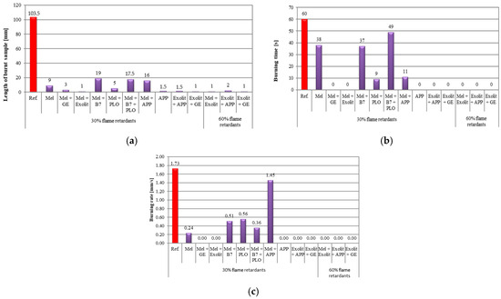 The horizontal burning test results presented in Figure 5 include three key parameters: length of the burned sample (a), burning time (b), and burning rate (c). The analysis of these data facilitates an assessment of the effect of individual modifications on the fire properties of the tested materials.