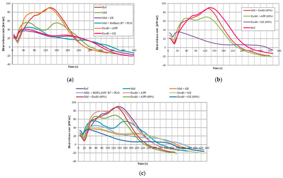 Rate of heat release for samples containing 30% FRs (a), samples containing 60% FRs (b), and all samples (c).