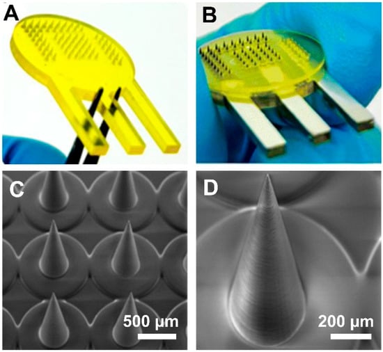Fabrication and morphological characterization of PmSL SLA 3D-printed MNA. (A) As-printed MNA structure, (B) fully assembled device with inkjet-printed conductive paths for three-electrode electrochemical sensing, (C) scanning electron microscopy (SEM) image showing the details of the MNA, (D) high-magnification SEM image of a single MN illustrating its fine tip resolution, essential for effective tissue penetration. Reprinted under a Creative Commons Attribution 3.0 Unported license [].