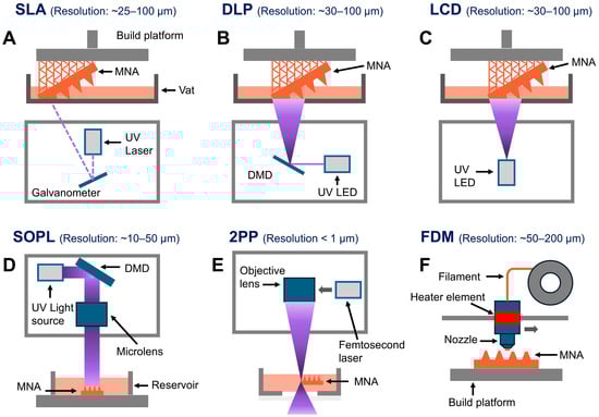 Schematic illustration of the working principles of key 3D printing techniques used for polymeric MNA fabrication: (A) SLA, (B) DLP, (C) LCD, (D) SOPL, (E) 2PP, (F) FDM.