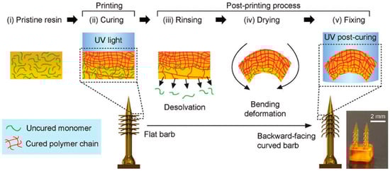 Schematic illustration of the 4D printing and post-processing workflow for barbed MNAs. (i) A pristine resin is selectively photopolymerized to form a crosslinked network, while uncured monomers remain in the structure. (ii) Rinsing removes the uncured monomers, leading to (iii) desolvation-driven shrinkage. (iv) Drying induces stress gradients across the cured regions, causing programmed bending deformation. (v) A final UV post-curing step fixes the structure into its backward-facing, curved barb configuration. Reproduced with permission from Wiley [].
