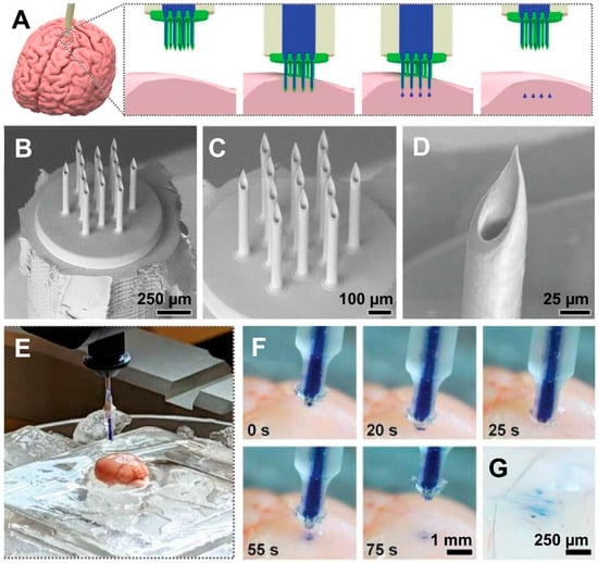 A developed MNA system for drug delivery to the brain. (A) Schematic illustration of the application of integrating MNA–capillary assemblies with nanoinjector systems to facilitate MNA-mediated simultaneous, distributed microinjections of target fluidic substances/suspensions into brain tissue. (B–D) SEM images of the fabricated MNA with different magnifications. (E) Experimental setup for the evaluation of the drug delivery capability of the developed MNAs, including the MNA–capillary assembly interfaced with a custom-built nanoinjector and an excised mouse brain on ice. (F) Sequential images of a representative MNA penetration, microinjection, and retraction process for a surrogate fluid (blue-dyed deionized water) injected into brain tissue. (G) Magnified view of the postinjection site. Adopted with permission from Wiley [].