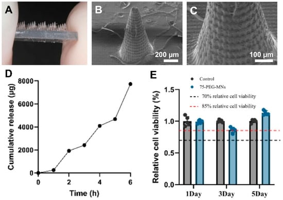 A developed MNA for drug delivery to the oral cavity. (A) Morphology of hydrogel MNA. (B,C) SEM images of the needle of the fabricated MNA with different magnifications. (D) Drug release profile showing that approximately 3.2% of madecassoside was released within 6 h, totaling 7.73 mg. (E) Effect of hydrogel MNA extracts on cell viability, showing a decrease of about 15% at day 3, which represented the lowest observed viability. Adopted under a CC-BY license [].