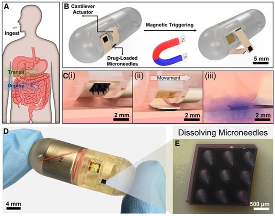 (A) Stages of capsule function, from ingestion to deployment and eventual excretion. (B) Schematic of the magnetic actuation mechanism, illustrating how the cantilever deploys in response to an external magnetic field. (C) Detailed view of cantilever (i) before deployment, (ii) during the deployment of drug-loaded MNAs into the tissue, and (iii) during the subsequent release of the drug. (D) Photograph of the fully assembled capsule. (E) Close-up of the dissolvable microneedle array designed to release the drug into GI tissue upon deployment. Reprinted with permission from Cell Press [].