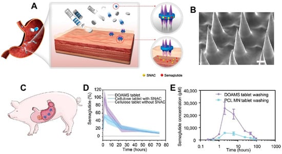 Schematic and experimental validation of the DOAMS MNA tablet system for gastric drug delivery. (A) Diagram showing pH-triggered deployment and anchoring of the tablet in the stomach. (B) SEM image of MNA. (C) Illustration of tablet delivery in pigs. (D,E) Plasma semaglutide profiles showing enhanced absorption with DOAMS compared to control tablets. Reprinted under a CC BY license [].