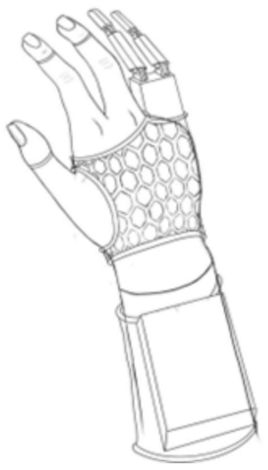 The first version (Figure 1) assumed that the control module, containing the microcontroller and power source, would be placed on the user’s forearm, hidden in a box printed from the PLA filament on a 3D printer. On the hand is a lightweight, honeycomb-like structure, also printed from the same polymer. A billiard glove is placed under the mesh structure to prevent abrasion of the patient’s hand skin due to the rigidity of the structure. In this concept, the servos were placed on the top of the hand, while the deflection sensors were placed under the billiard glove.