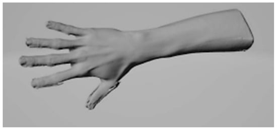 Next, the prosthesis was designed using CAD software—Autodesk Inventor 2025 and Autodesk Meshmixer version 3.5.0 (Autodesk, San Rafae, CA, USA) []. In this way, the shape and appearance of the prosthesis can be optimized. In order to perform a correct scan, the operation was performed in a darkened room. An important aspect was to immobilize the patient’s hand and forearm to homogenize the scan. The patient’s hand and forearm had to be scanned three times, precisely from each side, in order to process the FEM mesh.
