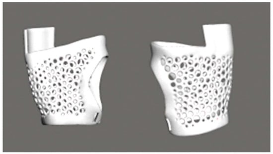 The internal and external part of the prosthesis, which will adhere to the patient’s hand, was designed using the honeycomb method with a 25% filling []. The honeycomb structure also provided a lower weight for this part of the prosthesis. MESHMIXER program version 3.5.0 selected the wall thickness and size of the prosthesis holes. The rounding of the prosthesis edges was introduced to reduce irritation and discomfort when wearing.