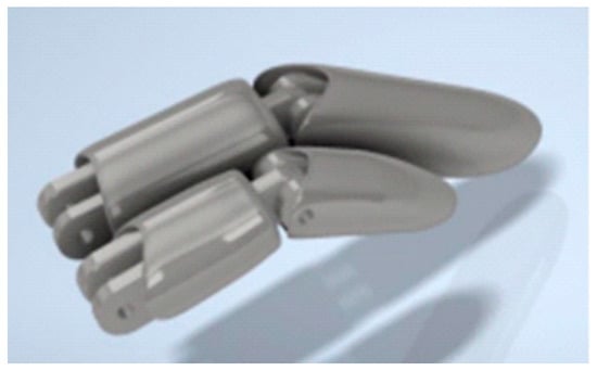 A survey of the literature on artificial hands and fingers reveals the existence of information pertaining to the design of artificial fingers, in which mechanics are combined with electronics, with consideration given to touch sensors [,]. Moreover, there are works describing the use of new materials for hand and finger prostheses, sensors, and manufacturing processes using, among others, 3D technology [,,,,]. In the work [], Siegel et al. conducted a comparative analysis of the grasping capabilities of three commercially available prosthetic hands and three 3D-printed prosthetic hands. The investigation revealed disparities in grip performance, which may be attributable to inadequately planned design processes or substandard printing quality.