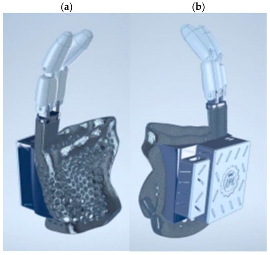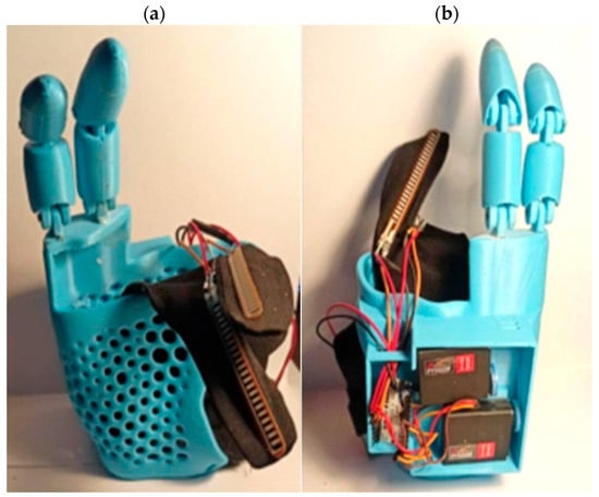 In the second concept (Figure 2) under consideration, the component layout was changed—all power and control components were placed on a box located on the top of the hand, eliminating the need to run wires and mechanisms from the forearm up to the hand. The microcontroller was reduced in size, and all controls were placed in a box. The design is based on a lightweight case printed from PLA, providing breathability and reducing the overall weight of the prosthesis []. This concept also uses a billiard glove to avoid abrasions to the skin of the hand and fingers.