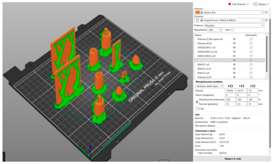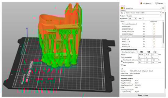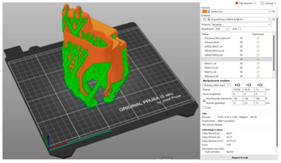 Three-dimensional printing model of the body of the prosthesis together with the boxes prepared in Prusa Slicer 2.8.1 (front view).