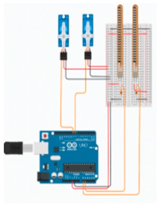 The design of the control system was created using TinkerCad software, which facilitates the modelling of the system without the necessity of possessing individual components in physical form, thereby eliminating superfluous costs (Figure 10). TinkerCad program has been found to be an intuitive one, with a database of components and sample systems that present correct methods of assembling individual elements. The connection of components to the contact board may be facilitated by dragging them to the relevant location. The electronic system controlling the operation of the entire hand was based on basic electronic components, compatible with the Arduino Nano Every controller. The wires were connected to two bend sensors, with dimensions of 73 × 6.3 mm (SparkFun SEN-10264, SparkFun Electronics, Niwot, Colorado, USA, and two servos capable of 180° rotation. These components were then soldered to the controller, which was powered by a 5 V Feetech Wing FT3325 battery (Feetech, Shenzhen, Guangdong, China). The Arduino Nano Every controller (ABX00028) (Arduino, Scarmagno, Italy) is equipped with an ATmega4809 microcontroller (8-bit AVR) and has 48 kB Flash memory, 6 kB SRAM, and 256 B EEPROM. Power is supplied via the USB port (5 V) or the VIN pin (6–21 V). The system is equipped with 14 digital I/O pins (6 of which are PWM-capable) and 8 analog inputs, in addition to supporting UART, SPI, and I2C interfaces. The programming of the device is facilitated by the utilization of the Arduino IDE environment via a USB micro-B connector. The dimensions of the board are 45 × 18 mm. The bend sensors employed function as flexible resistive sensors, whereby they undergo a change in resistance in accordance with the degree of deflection. In a straight state, the resistance is approximately 10 kΩ; however, with significant bending, this can increase to between 60 and 110 kΩ. The bending angle of the fingers is determined based on the changes in resistance. Subsequent to the conversion of the angle value to degrees by the Arduino controller, the signal is transmitted to the servos. Subsequently, the servos rotate at the calculated angle, resulting in the tightening of the cables responsible for the movement of individual fingers. The system utilizes digital Feetech Wing FT3325 micro-servos, which are distinguished by their high positioning precision and rapid response time, attributable to digital control. The supply voltage range is from 4.8 to 6 V, with the torque reaching 5.85 kg/cm at a lower voltage and 7.21 kg/cm at 6 V. The rotation time of 60° is measured at 0.16 s at 4.8 V and 0.13 s at 6 V. The movement range of the servo is from 0 to 120°. The design is founded upon metal gears and double ball bearings, thus increasing durability and reliability. The dimensions of the servo are precisely 30 × 10 × 35.5 mm, and its weight is 26.2 g. These parameters allow for precise reproduction of calculated deflection angles and stable operation in systems requiring precise motion control. The sensors were connected to the analog pin, and the pins to the servos to enable control. Two motors were developed, with one sensor assigned to the first servo and the other to the second servo. Subsequently, the deflection angle was converted to a rotation angle, enabling the adjustment of the finger bending angle via a cable. Subsequent to the activation of the entire system, the servos were automatically adjusted to the 0° position. Following the conclusion of the program, a time delay was incorporated with a view to ensuring the creation of the most seamless system possible. The power supply unit (PSU) was utilized to facilitate the operation of the control system, thereby ensuring the attainment of a consistent 5 V voltage, a prerequisite for the effective functioning of all electronic components. This solution obviated the necessity for more complex power supply systems or voltage converters, while ensuring mobility and convenience of use. The utilization of a power bank facilitated the uncomplicated charging and replacement of the power source, obviating the need for interference with the device’s construction. The operational longevity of the system is contingent upon the battery capacity employed; in the event of a sufficiently high capacity, the system is capable of continuously functioning for a number of hours, rendering it suitable for a variety of applications, including functional tests, presentations, and educational use.
