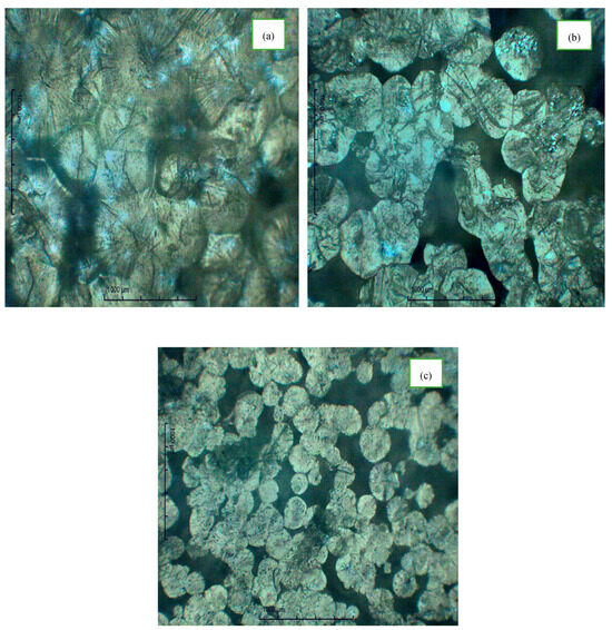 The optical micrographs presented in Figure 1 illustrate the characterization of pure the PE complex with ammonium iodide, and incorporated with . The characteristic spherulitic texture of is evident and reveals its lamellar crystalline configuration, with dark boundaries signifying the presence of an amorphous region within the polymeric matrix (Figure 1a) [13]. Upon the formation of the complexes with , a remarkable alternation in the spherulitic pattern is observed, accompanied by the increased presence of boundaries and dark regions (Figure 1b) [12]. This suggests a significant increase in the amorphous content, leading to a decrease in the crystallinity of the materials. The decrease in crystallinity of the polymeric complex was also validated by the results, which will be explained in the next section. A significant change in the spherulitic arrangement, and thus in the crystalline properties, was observed upon the incorporation of the ionic liquid– into the complex (Figure 1c). It was observed that the addition of to the polymer–salt complex resulted in a progressive increase in the amorphous region (dark region). The PEO::TMPI polymeric electrolyte matrix contributes to an increased level of amorphicity, characterized by a remarkable expansion of the dark and densely packed area, together with a significant reduction in the size of the spherulites, as illustrated in Figure 1c [14].