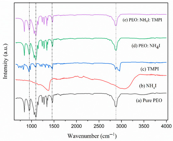 The Fourier transform infrared ( spectra for undoped , ammonium iodide (), , the complex with the polymer electrolyte, and the -infused polymer electrolyte are illustrated in Figure 2, with the associated peak assignments detailed in Table 1.
