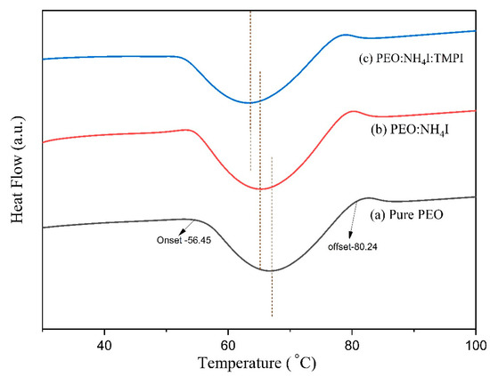 DSC thermograms of (a) pure PEO, (b) PEO:NH4I, and (c) PEO:NH4I:TMPI in the range of 20–100°C.