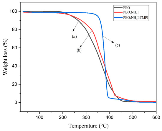 TGA thermograms of (a) pure PEO, (b) PEO:NH4I, and (c) TMPI-doped PEO:NH4I polymer electrolyte.
