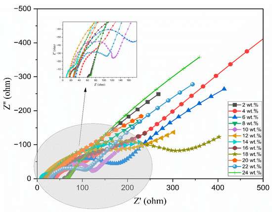 Ionic liquid was incorporated into the aforementioned polymer electrolyte to improve its conductivity. Figure 5 illustrates the Nyquist diagrams for PEO:NH4I containing different compositions (wt.%) of the TMPI ionic liquid in the polymer matrix. A semi-circular arc is observed in all samples, indicating the charge transfer resistance present at the interface between the electrode and the electrolyte. From Figure 5, the ionic conductivity was calculated using Equation (3), and the values are tabulated in Table 3. The ionic conductivity of the optimized polymer electrolyte increases on incorporating up to 14 wt.% of TMPI ionic liquid into the PEO:NH4I, as shown in Figure 6 and Figure 7, also shows the corresponding Nyquist diagram. The introduction of TMPI results in a continuous increase in the ionic conductivity but also provides mobile charge carriers that facilitate conduction.