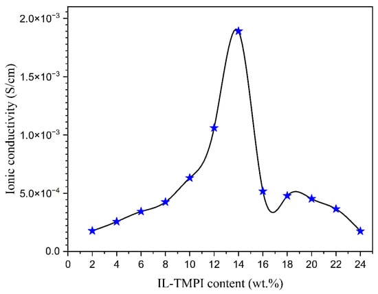However, after 14 wt.% TMPI, the ionic conductivity began to decrease, which may have been due to the presence of ion pairs associated with charge carriers impeding their mobility within the polymer matrix, as documented in the literature. This restricts the free movement of charge carriers, creating a barrier that ultimately results in reduced conductivity [44].