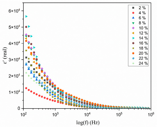The optimal approach to assessing the increase in the free ion density within the polymer matrix, which leads to enhanced conductivity, is through the evaluation of its dielectric properties. The process of ion transport is significantly influenced by several key factors, and one of these is the dielectric constant () of the polymer electrolyte. A comprehensive understanding of the conductivity mechanisms necessitates an examination of the dielectric properties of the ionically conducting polymer electrolyte. A distinctive characteristic of polymer electrolytes is that the movement of ions transpires without significant long-range displacement of the solvent [45]. The process of ion transport within PEs is complex, involving not only the movement of the ions but also the localized motion of the polymer segments and the transport of ions both within and between polymer chains at coordination sites. The dielectric properties can be determined through calculation by