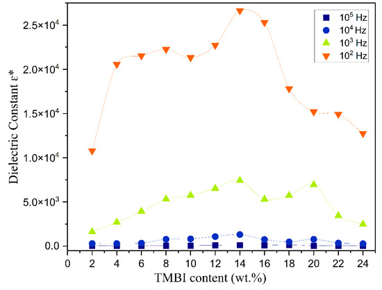 Figure 8 and Figure 9 illustrate the change in the real and imaginary components of the dielectric constants ( and ) as a function of frequency for the polymer electrolyte and different TMPI compositions (2–24 wt.%) at room temperature. The data presented in both figures indicate that frequency dispersion in and is observed in the low-frequency range, particularly at 102 Hz, where the values are notably high. Subsequently, there is a sharp decline in these values as the frequency increases. The values of and are anticipated to stabilize in the high-frequency region of both spectra; however, the lack of observed steady states is attributed to the restricted frequency range achievable in this experiment. Consequently, only the dispersion component of the dielectric constants is observable at lower frequencies, with the trend in this dispersion’s variation illustrated in the insets in Figure 8 and Figure 9. Overall, the significant rise in and in low-frequency ranges can be attributed to the buildup of space charge carriers at the interface between the electrode and the electrolyte, as well as the alignment of the dipoles from localized molecular polar groups that contribute to polarization. The space charge phenomenon results in the confinement of the charge carriers, as the ions cannot interact with the solid-state blocking electrodes [46]. The value for the 14 wt.% TMPI-doped PEO;NH4I exhibits a significantly high dielectric (ɛ*) of 2.66 × 104 at room temperature, as shown in Figure 10. As a result, the polymer electrolyte with 14 wt.% TMPI demonstrates the highest ionic conductivity among all of the polymer electrolytes. This increase in the dielectric constant values can be attributed to the enhanced ionic conductivity of the polymer matrix, which is a result of the uniform distribution of the charge carriers within the polymer matrix. Conversely, there is a significant decline in the high-frequency range across all samples, primarily due to the rapid periodic reversal of the applied electric field. This rapid change limits the time available for the charge carriers to align with the direction of the electric field. Consequently, there is minimal excess diffusion of ions in the field direction, resulting in a reduction in the dielectric constant values. An increase in the number of charge carriers leads to a more pronounced polarization effect and greater energy dissipation. This phenomenon is evident from Figure 10, particularly for the highly conductive 14 wt.% TMPI-doped polymer electrolyte, and demonstrates the highest dielectric constant ( and ) in the lower-frequency range. This enhancement is primarily attributed to the free ions of TMPI, which elevate the charge carrier concentration in the polymer matrices. Consequently, the free mobile ions may associate and form pairs and aggregates, leading to the formation of clusters [47]. This clustering effect subsequently diminishes the electric constant value at a higher TMPI value. The findings from this study align well with the previously discussed ionic conductivity results.