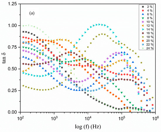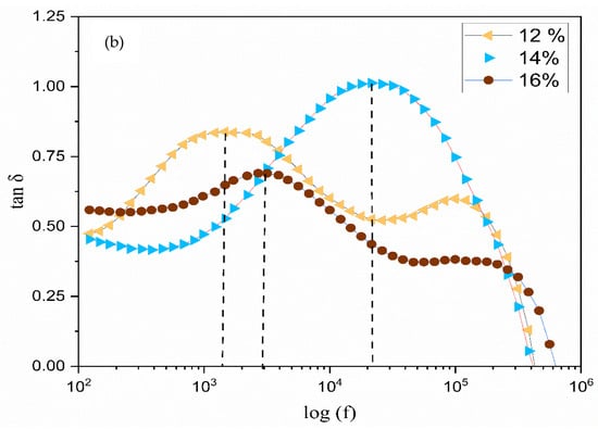 The relaxation mechanisms of polymer electrolytes are specifically examined through an analysis of the loss tangents peaks, with the dipoles of the polymer electrolyte elucidated in the context of dielectric relaxation. Figure 11a illustrates the relationship between the loss tangent, dielectric relaxation, and frequency for all polymer electrolytes. The peak of the tangent delta is observed to shift towards a higher-frequency range relative to the loss tangent peak, suggesting that the relaxation process is absent in the electrolyte [48]. It is widely recognized that the presence of permanent or induced dipoles contributes to conductivity and the emergence of the dielectric relaxation peak in the graph. The peaks depicted in Figure 11a reflect translational dynamics of ions which are linked to the relaxation of ionic conductivity. As the frequency increases, the tan δ also rises due to the predominance of the ohmic (active) component over the capacitance reactive element [49].