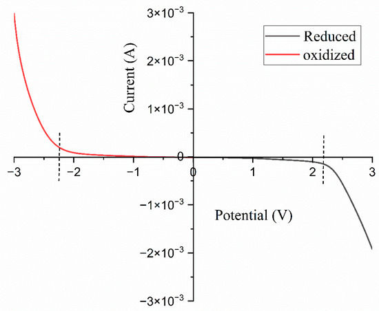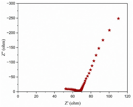 The graph clearly shows a linear relationship, indicating bulk resistance in the low-frequency region, specifically in the area (on the y-axis). According to Equation (12), the calculated capacitance reached 73.69 F at the peak value in the area (on the x-axis). The capacitance value derived from low-impedance spectroscopy can be compared with the value obtained from the cyclic voltammetry profile at 50 mV/s (Table 8). The capacitance values from both methodologies are nearly identical, as they reflect ion transport dynamics that are close to equilibrium [58].