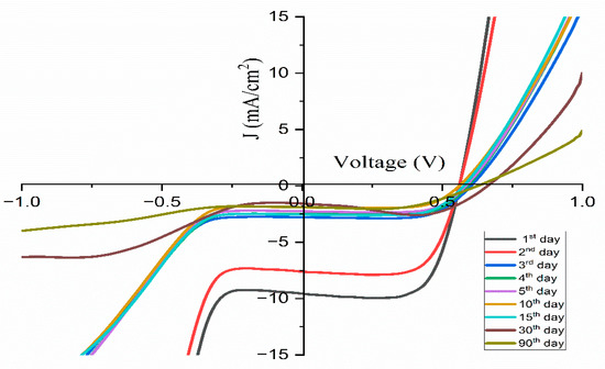 Variation in J-V curves for DSSCs under one sun conditions in different time periods.