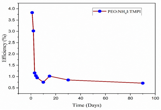 To evaluate the standard application of these cells, the JSC and VOC parameters were continuously monitored for a period of 90 days as shown in Figure 18. The findings are summarized in Table 7, which refers to the DSSC using a polymer electrolyte composed of 14 wt.% TMPI. The data indicate a consistent performance up to the fourth day, as shown in Figure 19. Consequently, the DSSC with the TMPI-doped polymer electrolyte demonstrates exceptional long-term stability, as shown in Figure 20. The observed decrease in efficiency after 10 days may be due to volatilization and leakage, which occur during prolonged operation and negatively affect the performance of DSSCs. However, by day 30, a slight recovery in efficiency was recorded, which may have been due to stabilization of the polymer electrolyte’s morphology or an improvement in ionic conduction after the initial relaxation and recombination stage [56]. However, the efficiency of the DSSC using doped TMPI shows an improvement, confirming that TMPI not only improves the conductivity but also increases the efficiency of the DSSC.