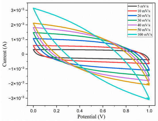 Cyclic voltammograms were recorded over a potential range of 0 to 1 V using different sweep rates, as illustrated in Figure 20. In cases where the capacitance remains stable despite potential variations, the resulting CV curves exhibit a distinctive rectangular profile. However, when the capacitance is affected by the potential, the voltammograms exhibit a consistent rectangular shape at all sweep rates. This indicates potential-independent capacitance behavior. This shape also implies rapid ionic switching at the interfaces between the electrode and the electrolyte, as well as the favorable capacitive characteristics of the electrodes. From the CV curves, the specific capacitance can be calculated from the following, Equation (12):