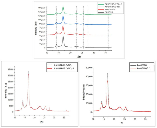 Figure 3 presents the X-ray diffraction (XRD) patterns of PANI/PEO, PANI/PEO/LC, PANI/PEO/LC/TiO2, and PANI/PEO/LC/TiO2(2X) within the 5–40° (2θ) range. The XRD pattern of PANI exhibits diffraction peaks at 14.104°, 16.940°, and 18.54°, with the peak at 16.94° being particularly indicative of the characteristic crystallinity of PANI. The doping of PANI with CSA (camphor sulfonic acid) has been observed to increase the intensity of this diffraction peak, while the peak at 14.104° is likely to have emerged due to CSA’s structural influence on PANI, as CSA enhances the regularity and crystallinity of the polymer. The amorphous nature of PEO (polyethylene oxide) contributes to a broad peak formation in the 15–19° range; however, the presence of CSA mitigates the amorphous effect of PEO, stabilizing the crystalline phase in specific regions. In the PANI/PEO/LC sample, the regenerated cellulose used belongs to the cellulose II crystalline form, which has been observed to largely preserve the crystalline phases of PANI. While the XRD peaks of PANI and PANI/PEO/LC are located in similar regions, the incorporation of LC enhances crystallinity in the 18–22° range, with the 28.279° peak becoming more pronounced, indicating the formation of a new crystalline phase due to PANI–LC interactions. The literature also indicates that cellulose reinforcement stabilizes the crystalline structure of the PANI matrix [55]. The XRD pattern of PANI/PEO/LC/TiO2 reveals diffraction peaks at 27.48°, 34.33°, 36.09°, and 54.35°, corresponding to the anatase phase of TiO2. In the PANI/PEO/LC/TiO2:2 sample, the increase in TiO2 concentration has led to the emergence of new crystalline phases, indicating an enhancement in the material’s crystallinity. However, the interaction between PANI and TiO2 results in weakened peak intensities [56,57,58,59]. These findings demonstrate that an increase in TiO2 concentration contributes to enhanced crystallinity in PANI-based systems, leading to a more structured and highly crystalline material.
