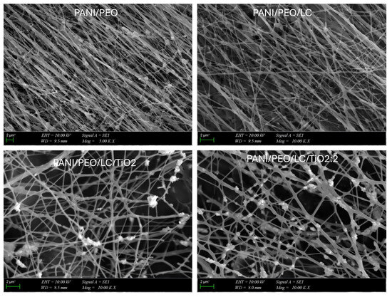 SEM micrographs of PANI/PEO, PANI/PEO/LC, PANI/PEO/LC/TiO2, and PANI/PEO/LC/TiO2:2 composites nanofibers.
