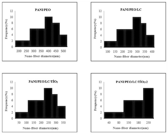 The diameter distributions of the biocomposite nanofibers are illustrated in Figure 5. The PANI/PEO nanofibers had a minimum diameter of 212 nm and a maximum diameter of 490 nm. Incorporating LC into the PANI/PEO nanocomposites resulted in more aligned, smaller, and uniform fibers, with diameters ranging from 134 nm to 389 nm. The PANI/PEO/LC/TiO2 nanocomposites exhibited even smaller diameters, ranging from 56 nm to 236 nm. The PANI/PEO/LC/TiO2:2 nanocomposites showed the smallest diameters, with a minimum of 42 nm and a maximum of 218 nm. The decrease in nanofiber diameter and increased branching are attributed to the enhanced solution conductivity. Higher solution conductivity facilitates the production of finer fibers and increases the droplet charge that forms the Taylor cone. The PANI/PEO/LC/TiO2:2 nanocomposite demonstrated the most optimized fiber distribution and diameter among all the samples.