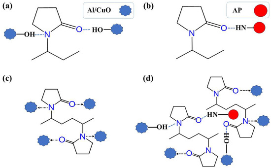 (a) Hydrogen bonds in Al/CuO–PVP, (b) hydrogen bonds in AP–PVP, (c) coordination bonds in Al/CuO–PVP, and (d) bonds formed by PVP between Al, CuO, and AP.