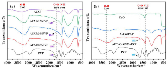 (a) Al/AP, Al/AP/1%PVP, Al/AP/3%PVP, Al/AP/5%PVP, PVP, and (b) CuO, Al/CuO/AP, Al/CuO/AP/PVP, PVP have distinct specific vibration bands (expressed in cm−1) in their Fourier transform infrared spectra (FTIR).