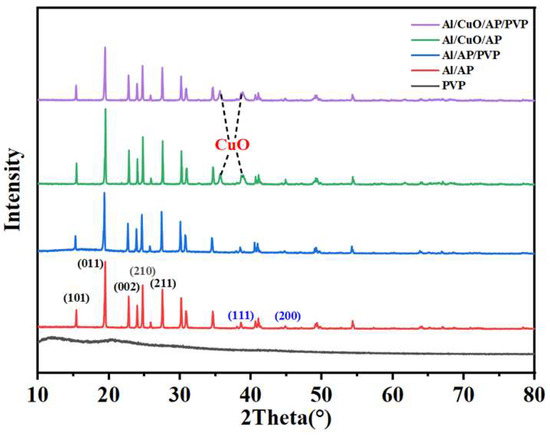 After adding PVP, the XRD pattern did not show significant changes for the following two reasons: (1) PVP does not react chemically with Al/AP but is merely physically mixed; therefore, its main characteristic peaks do not undergo significant changes, and (2) PVP is typically an amorphous polymer material. Amorphous materials give rise to broad diffuse peaks in the XRD spectrum. Natural PVP is inherently amorphous with weak characteristic features, and thus does not show prominent peaks in the XRD spectrum [40].