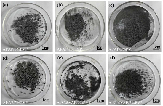 First, an Al/CuO composite system with an equivalent ratio Φ of 1.2 was prepared using the ultrasonic dispersion method to replace Al. The original process was used to obtain Al/CuO/AP/x%PVP composite microspheres (where x% represents the concentration of PVP). Al/CuO/AP microspheres without PVP were used as blank samples. The parameters of the prepared samples (e) and (f) are listed in Table 1. The equivalent ratio Φ represents the fuel/oxidizer ratio [32].