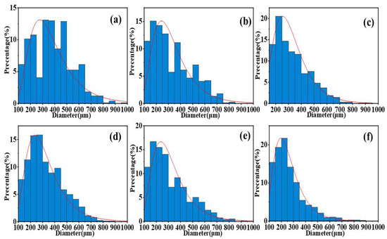 Comparison of Figure 6a–d shows that as the PVP content increases, the variance of the particle size distribution of the samples decreases significantly, and the particle size distribution gradually concentrates in the 200–300 μm range. This indicates that the size distribution of the particles prepared using our method tends to be uniform, and its distribution pattern is closer to a normal distribution curve. This conclusion is further corroborated by the comparison of Figure 6e,f. These results clearly demonstrate the significant role of PVP in improving the uniformity of the particle size distribution of the sample.