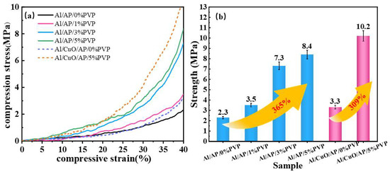 Using a universal testing machine, composite microspheres with uniform mass and size, including Al/AP, Al/AP/1%PVP, Al/AP/3%PVP, Al/AP/5%PVP, Al/CuO/AP, and Al/CuO/AP/5%PVP, were compressed in an impact sensitivity mold until the compression strain reached 40%. The obtained stress–strain curves are shown in Figure 8a and indicate a significant positive correlation between the composite microsphere strength and the PVP concentration. Figure 8b quantitatively demonstrates that the strength ranking of the Al/AP system is Al/AP < Al/AP/1%PVP < Al/AP/3%PVP < Al/AP/5%PVP, with the addition of 5% PVP resulting in the strength of 8.4 MPa, corresponding to an increase in the strength by 365% relative to that of Al/AP. The increased slope of the stress–strain curve further confirms the significant enhancement of material strength. For the CuO-containing systems, the strength ranking is Al/CuO/AP < Al/CuO/AP/5%PVP, with the addition of 5% PVP resulting in the strength of 10.2 MPa, which corresponds to a 309% increase relative to that of Al/CuO/AP, validating the universality of PVP interface enhancement. The high strength enhancement primarily stems from the crosslinked network formed by PVP, which serves as a structural framework, with its C=O/C-N groups forming hydrogen bonds/coordination bonds with Al/AP to create a crosslinked network. This network enables the material to absorb a large amount of energy under stress and inhibits crack propagation, endowing the material with exceptional damage tolerance properties. In the Al/CuO/AP ternary system, PVP achieved high strength by bridging the Al/CuO-AP multi-level interfaces. Both macroscopic mechanical behavior and microscopic structural analyses confirmed the importance and effectiveness of the PVP addition.
