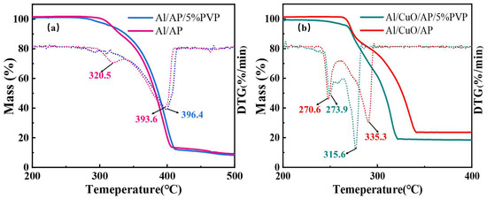 As shown in Table 2 and Figure 9a, the exothermic decomposition temperature (HTD) of the Al/AP composite material is lower than that of pure AP [49], indicating that Al promotes AP decomposition. Furthermore, the addition of PVP slightly increases the HTD of the Al/AP composite material, and only a single decomposition peak is observed on its TG curve, which is attributed to PVP coating the AP, which causes the HTD and LTD to merge [50,51]. However, in the Al/CuO/AP system (Figure 9b), the HTD of AP was significantly reduced by approximately 60 °C, demonstrating that CuO has a strong catalytic effect on the decomposition of AP, significantly enhancing the reactivity of the composite energetic microspheres. Notably, the HTD values of the samples with added PVP were even lower, indicating that PVP influenced this system, further enhancing the catalytic activity of CuO toward AP at high temperatures [52].