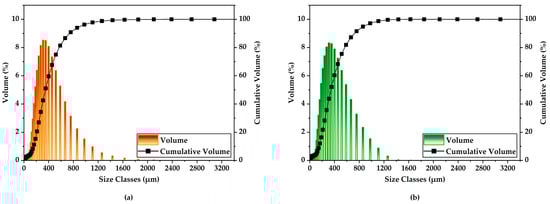 Particle size distribution (PSD) was measured using a Malvern Mastersizer 3000 laser diffraction analyzer (Malvern Instruments, Ltd., Malvern, UK). A dry dispersion method with 4-bar air pressure and 15% feed rate ensured effective dispersion and 5% obscuration. PSD measurements were performed five times, and averages reported [38].