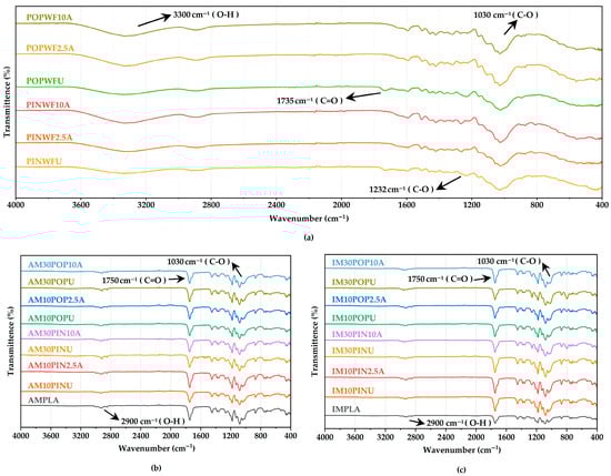 FT-IR spectroscopy was employed to investigate the chemical composition and potential interfacial interactions among untreated and NaOH-treated waste wood flour, the neat PLA, and their corresponding biocomposites (Figure 2). The present findings show a clear congruence with previously reported data, thereby reinforcing the reproducibility and reliability of the observed outcomes [57,58,59,60,61].