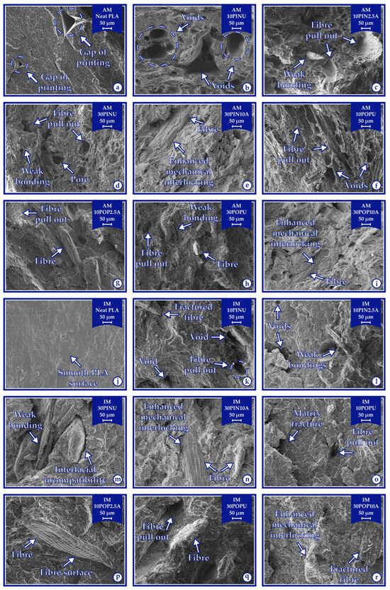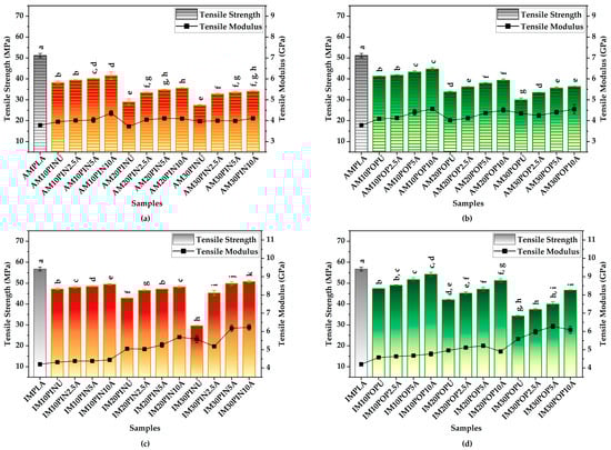 The effectiveness of alkali treatment in IM samples. Among pine-reinforced IM biocomposites, IM30PIN10A exhibited a 71.35% increase in tensile strength following treatment (from 29.67 MPa to 50.83 MPa; p < 0.001). Similarly, the poplar wood flour-reinforced IM30POP10A showed the highest tensile strength among its group, reaching 46.63 MPa, which corresponds to a statistically significant 36.16% improvement over its untreated counterpart (34.25 MPa; p < 0.001). Although the IM-fabricated neat PLA (IMPLA) sample exhibited the highest absolute tensile strength (56.77 MPa), the relative enhancements through wood flour treatment underscore the crucial role of surface modification. IM samples with lower wood flour content, such as IM10PIN2.5A and IM10POP2.5A, exhibited limited tensile strength increases of 1.78% (from 47.23 MPa to 48.07 MPa; p > 0.05) and 3.36% (from 47.37 MPa to 48.96 MPa; p < 0.05), respectively, as shown in Figure 3c,d.
