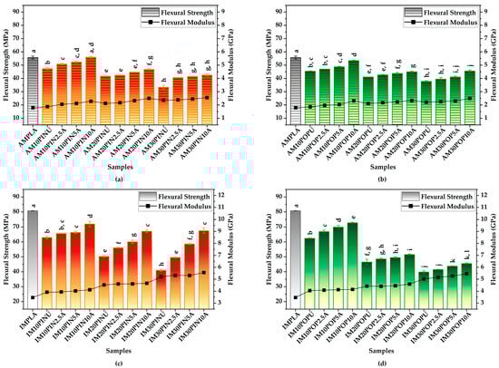 On the other hand, as illustrated in Figure 4a,b, the most notable enhancement among the AM samples reinforced with poplar wood flour was observed in AM10POP10A, which exhibited a statistically significant 24.07% increase in flexural modulus compared to its untreated counterpart (from 1.86 GPa to 2.31 GPa; p < 0.001). Within this group, the AMPLA sample exhibited the lowest flexural modulus, with a value of 1.79 GPa.