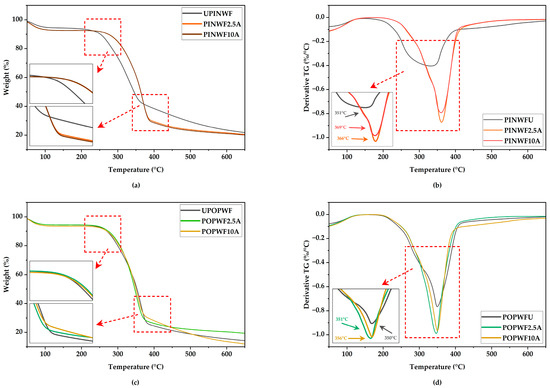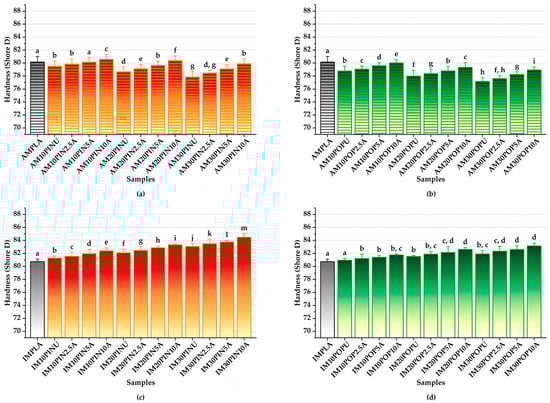 As shown in Figure 5c,d, among the IM samples reinforced with pine wood flour, IM30PIN10A demonstrated the most notable rise in hardness, achieving a 1.69% increase compared to its untreated counterpart (from 83.08 to 84.48; p < 0.05). Similarly, among the IM samples reinforced with poplar wood flour, IM30POP10A demonstrated the most significant enhancement, achieving a 1.54% increase in hardness relative to the untreated sample (from 81.90 to 83.16; p < 0.05). In contrast, the IMPLA exhibited the lowest Shore D hardness of 80.74 within the IM group.