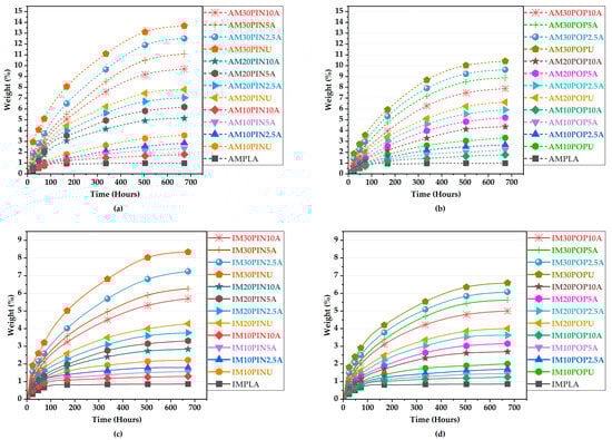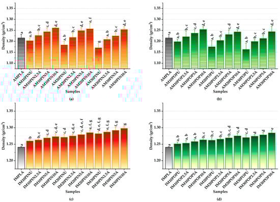As shown in Figure 6c,d, among the IM samples reinforced with pine wood flour, IM30PIN10A demonstrated a statistically significant enhancement in density, achieving a 1.25% increase compared to its untreated counterpart (from 1.28 to 1.30 gr/cm3; p < 0.05). Similarly, among the IM samples reinforced with poplar wood flour, IM30POP10A demonstrated the highest observed increase, achieving a 1.10% increase in density relative to the untreated sample (from 1.27 to 1.28 gr/cm3; p > 0.05). The IMPLA exhibited the density of 1.24 gr/cm3 within the IM group.