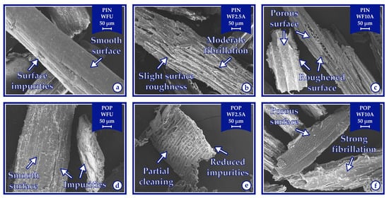 Among the IM samples reinforced with pine wood flour, IM30PIN10A showed the highest improvement in flexural strength, achieving a 64.74% increase compared to its untreated counterpart (from 40.99 MPa to 67.53 MPa; p < 0.001), as shown in Figure 4c,d. Similarly, among the IM samples reinforced with poplar wood flour, IM10POP10A demonstrated the most significant enhancement, achieving a 16.72% increase in flexural strength relative to the untreated sample (from 62.31 MPa to 72.73 MPa; p < 0.05).