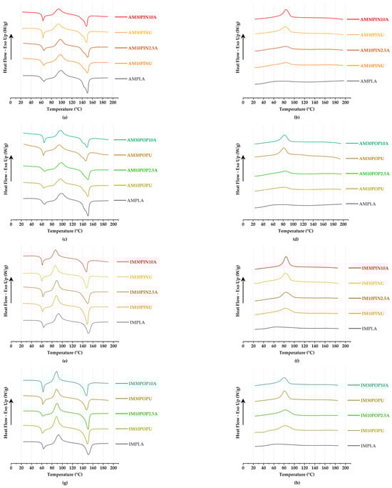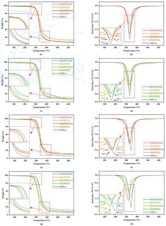 As seen in Figure 4c,d, the flexural modulus of IM biocomposites progressively increased with rising untreated wood flour content. The pine-wood flour-reinforced IM30PIN10A achieved a flexural modulus of 5.56 GPa, corresponding to a 6.75% enhancement compared to its untreated counterpart (5.21 GPa; p < 0.05). Similarly, among the poplar wood flour-reinforced biocomposites, IM30POP10A exhibited the highest enhancement, with an 8.55% increase compared to its untreated counterpart (from 5.03 GPa to 5.46 GPa; p < 0.05). The IMPLA sample recorded the lowest flexural modulus at 3.47 GPa.