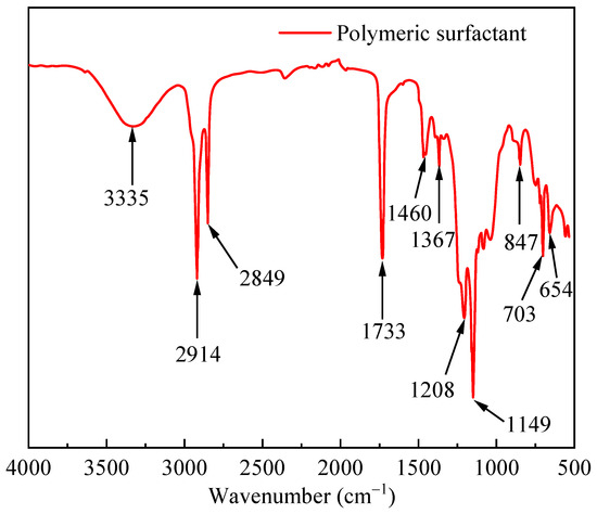 Figure 1 shows the infrared spectrum of the PS. The stretching vibration peak at 3335 cm−1 was a hydrogen bond binding the hydroxyl group of the acrylic ester side chain with water. The peaks at 2914 cm−1 and 2849 cm−1 were attributed to methyl symmetric stretching vibrations. The characteristic absorption peak of the carbon–oxygen double bond was at 1733 cm−1. The deformation vibration peak of the methylene group was at 1460 cm−1. The peak at 1367 cm−1 was attributed to the symmetric bending vibration of the methylene group. The peaks at 1208 and 1149 cm−1 were attributed to the stretching vibration of the carbon-oxygen bond. The stretching vibration peak of the carbon–fluorine bond was at 847 cm−1. The stretching vibration peaks of the carbon–sulfur bond in the molecule were at 703 cm−1. The peak at 654 cm−1 was the out-of-plane bending of oxygen–hydrogen bonds.