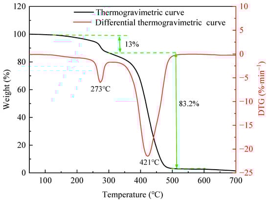 Figure 2 shows the thermogravimetric and differential thermogravimetric curves of the PS. Its decomposition process included 50–125, 125–296, 296–498, and 498–700 °C. The mass of the PS decreased slightly in the first stage due to the volatilization of bound water. Its mass declined by 13% and the decomposed fastest at 273 °C in the second stage, owing to the breaking of side chains [17]. In addition, it dropped significantly by 83.2% in the third stage due to the breaking of the leading chains (C-C). Its fastest degradation temperature was 421 °C, indicating good thermal stability.